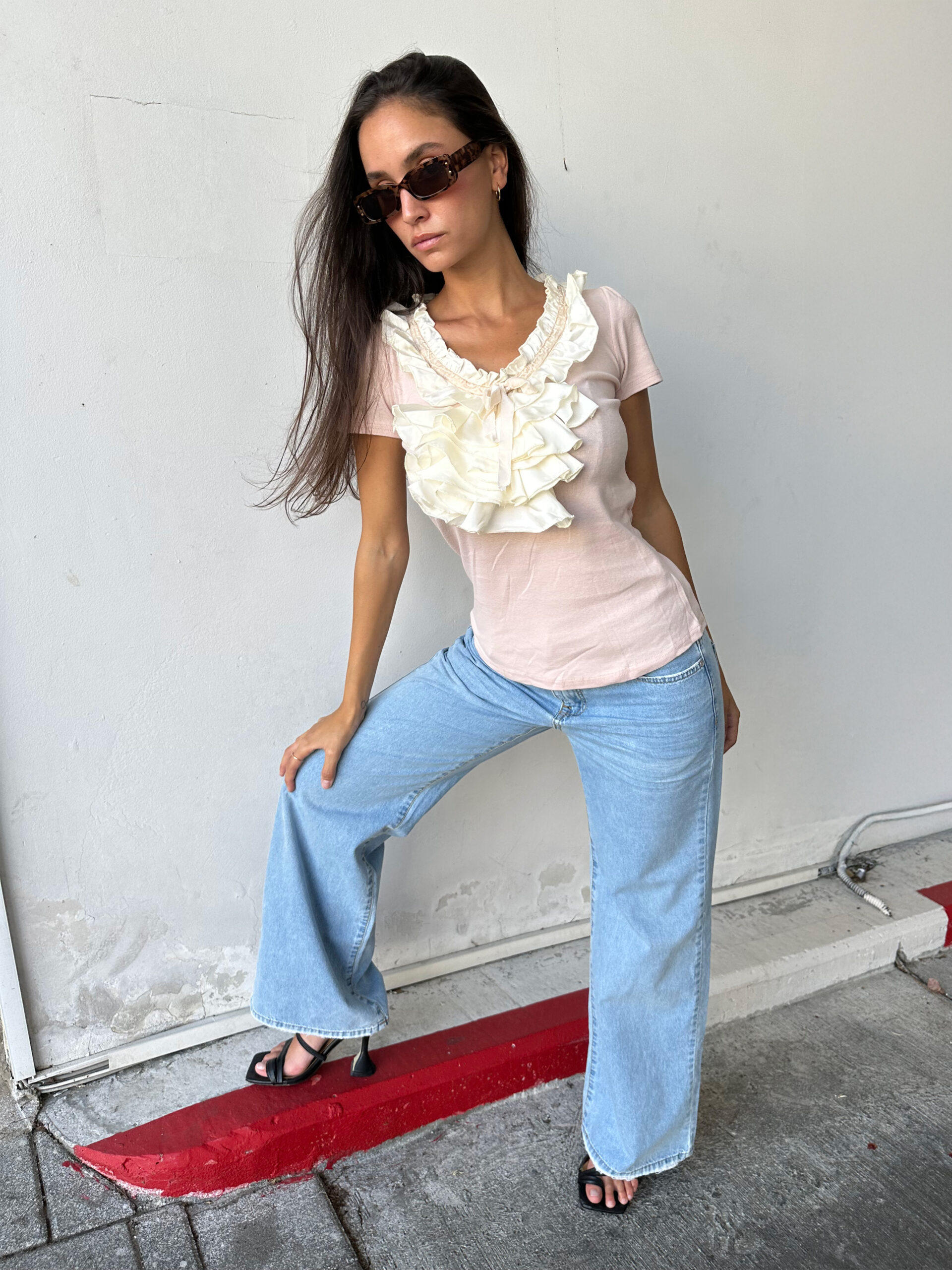 החולצה נמתחת, יושבת יפה על הגוף ומתאימה כשכבת בסיס מושלמת או כפריט מרכזי בלוק נקי, רומנטי ונשי.