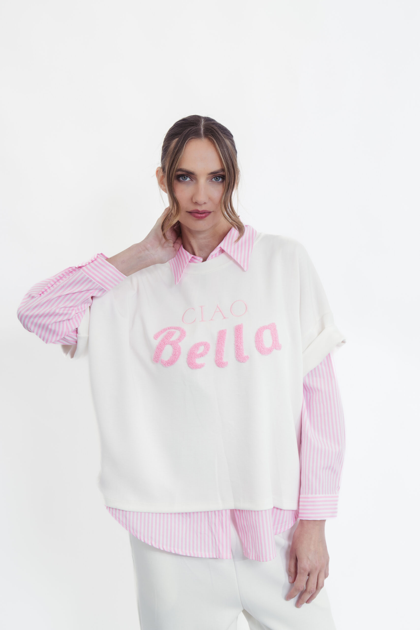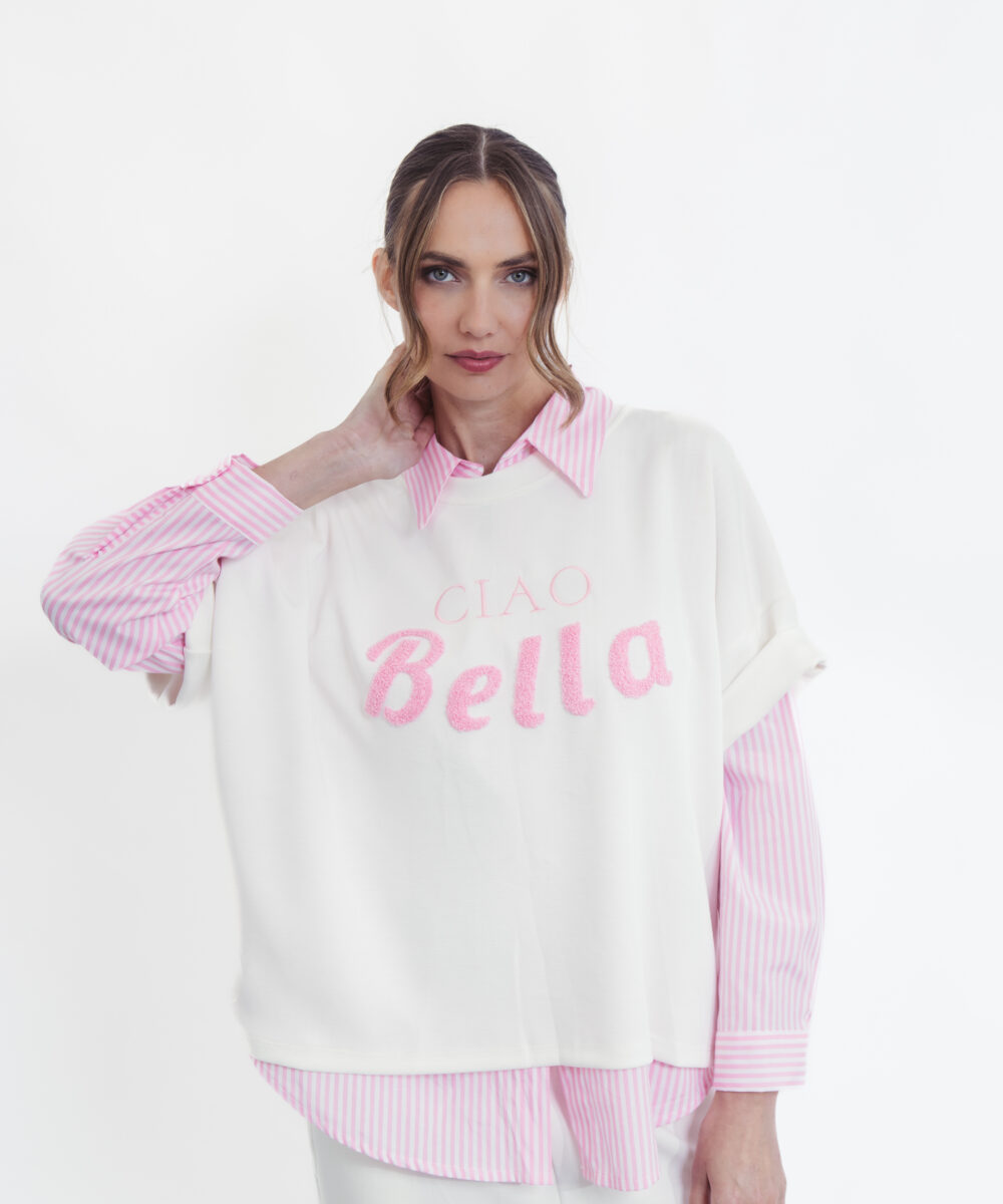 חולצה בגזרה משוחררת ונוחה מבד רך ונעים, עם הדפס Ciao Bella שמעניק מראה צעיר ושיקי. מושלמת ללוק יומי קליל ומלא סטייל. ניתן לשלב עם ג’ינס, חצאית או להוסיף מכנס תואם לסט אופנתי ונוח במיוחד. ✨