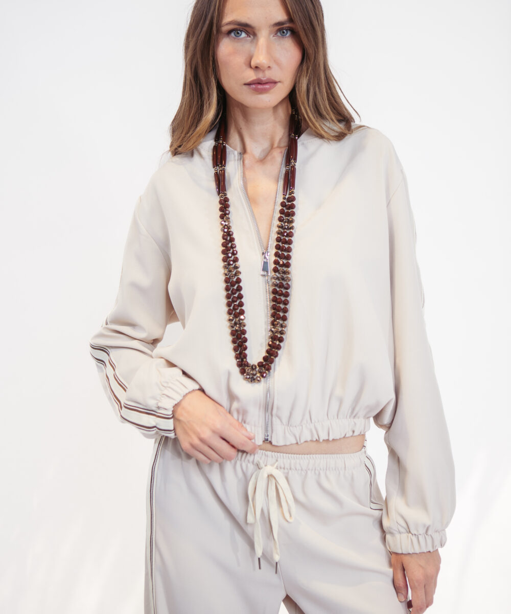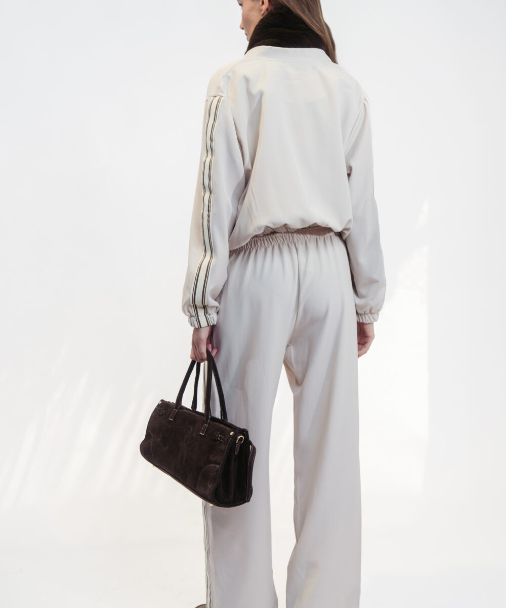 חליפה פסים למראה יוקרתי ונוצץ, בגזרה נשית ורכה שמוסיפה אלגנטיות לכל לוק.
