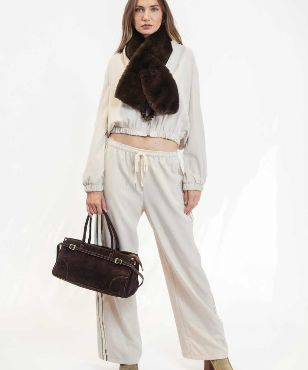חליפה פסים למראה יוקרתי ונוצץ, בגזרה נשית ורכה שמוסיפה אלגנטיות לכל לוק.