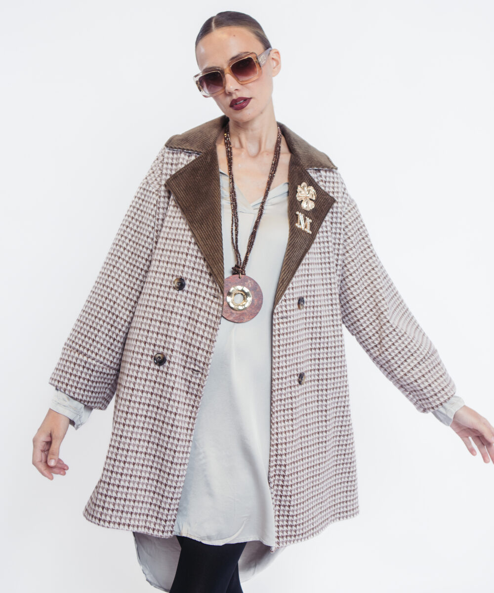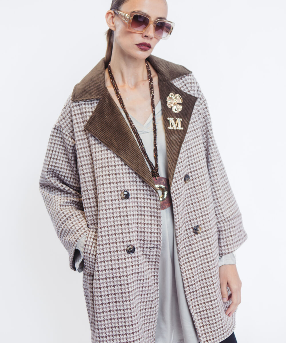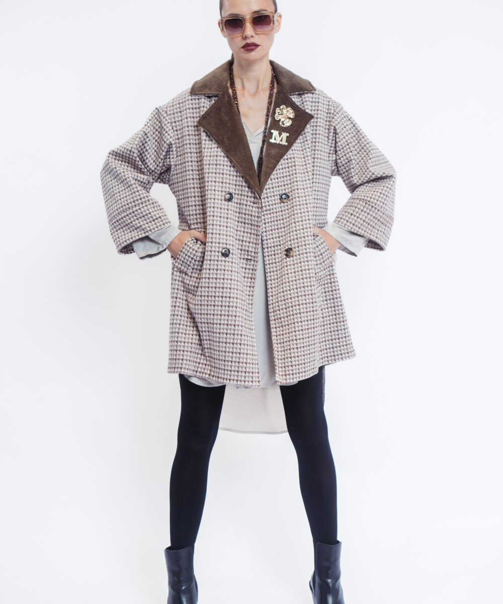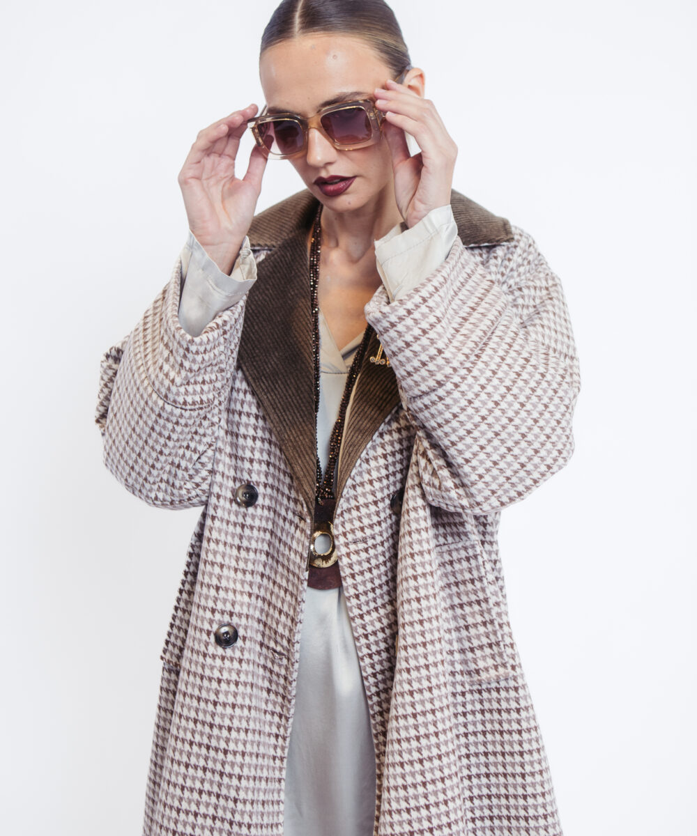 מעיל משובץ ומרשים בגזרה רחבה ונשפכת, המשלב בין אלגנטיות קלאסית לנוכחות אופנתית חזקה.