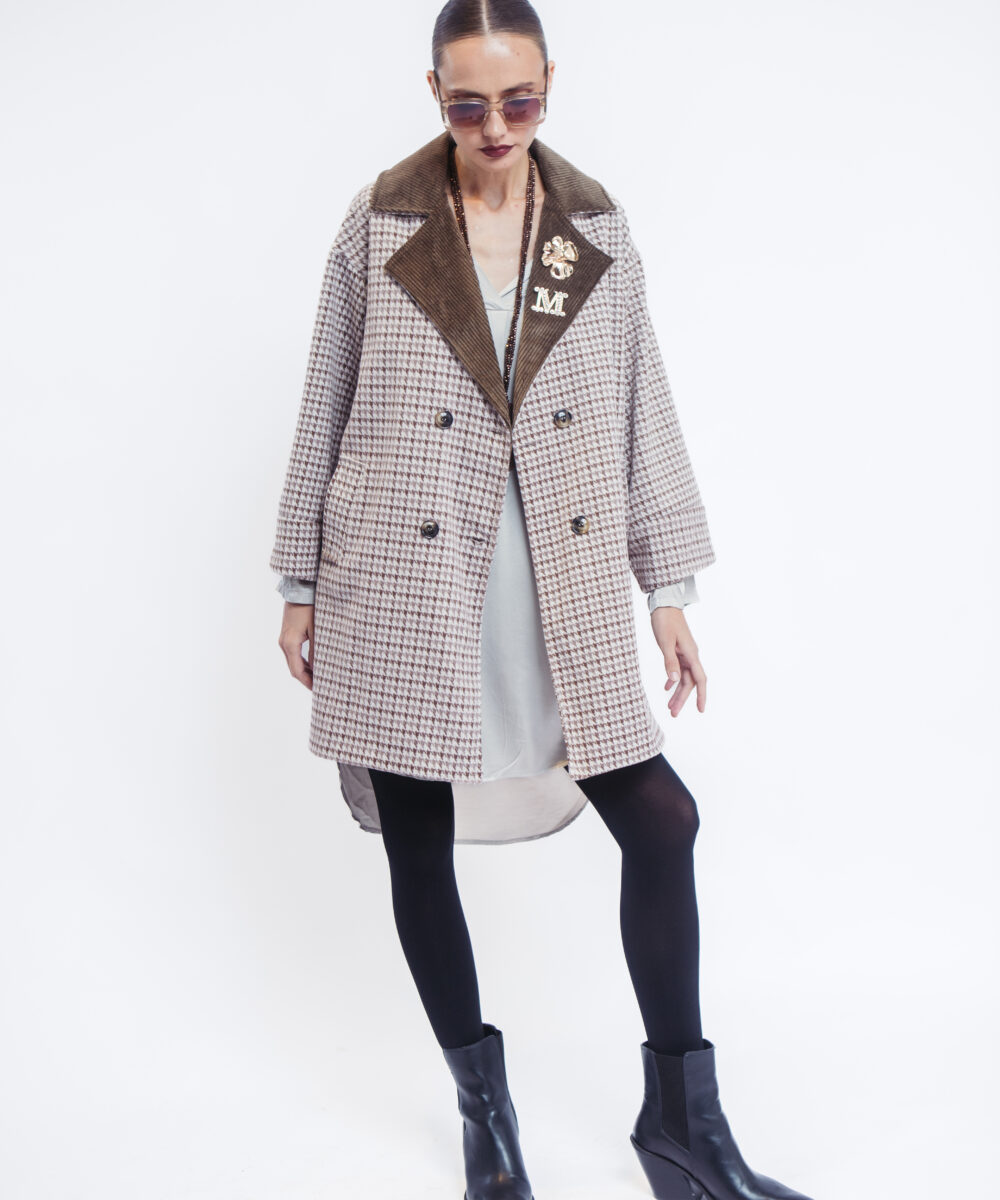 מעיל משובץ ומרשים בגזרה רחבה ונשפכת, המשלב בין אלגנטיות קלאסית לנוכחות אופנתית חזקה.