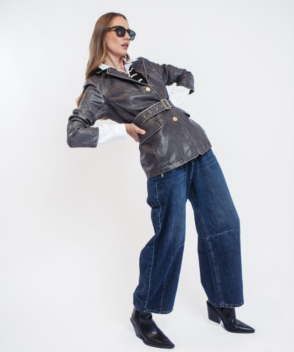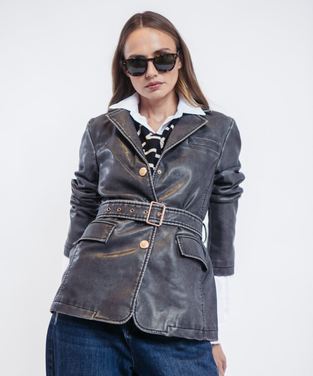 🧥 מעיל דמוי עור אפור עם חגורה