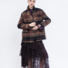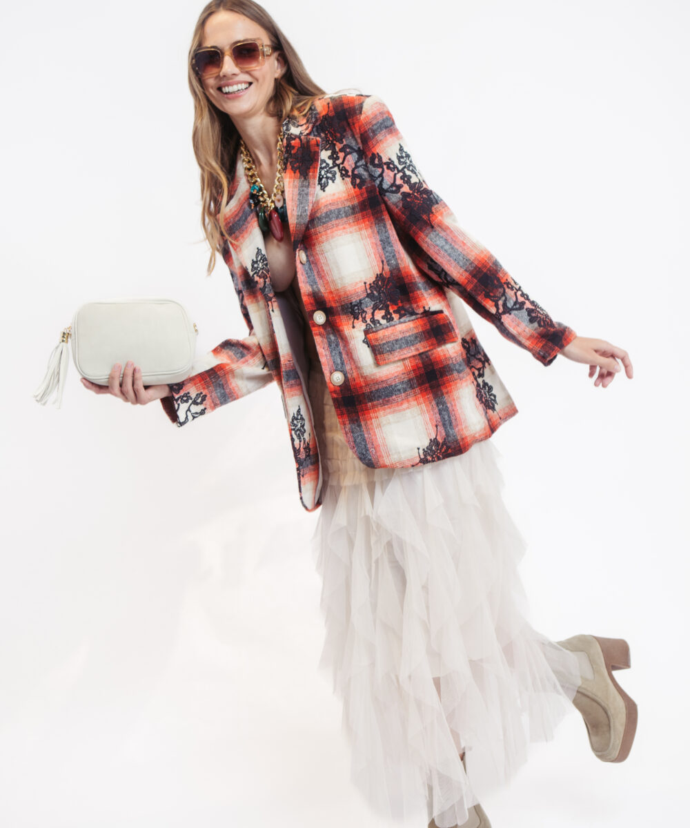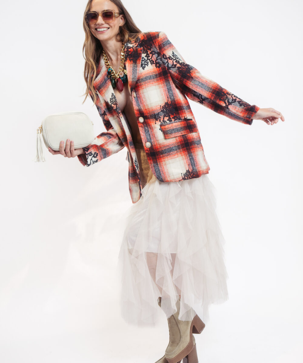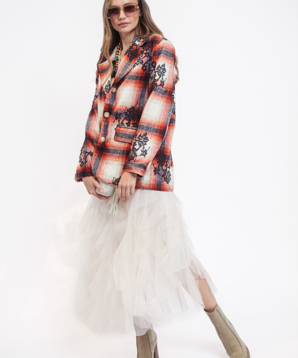מעיל משובץ צבעוני בגזרה מחמיאה, עם שילובי תחרה עדינה שמוסיפים ייחוד וסטייל.