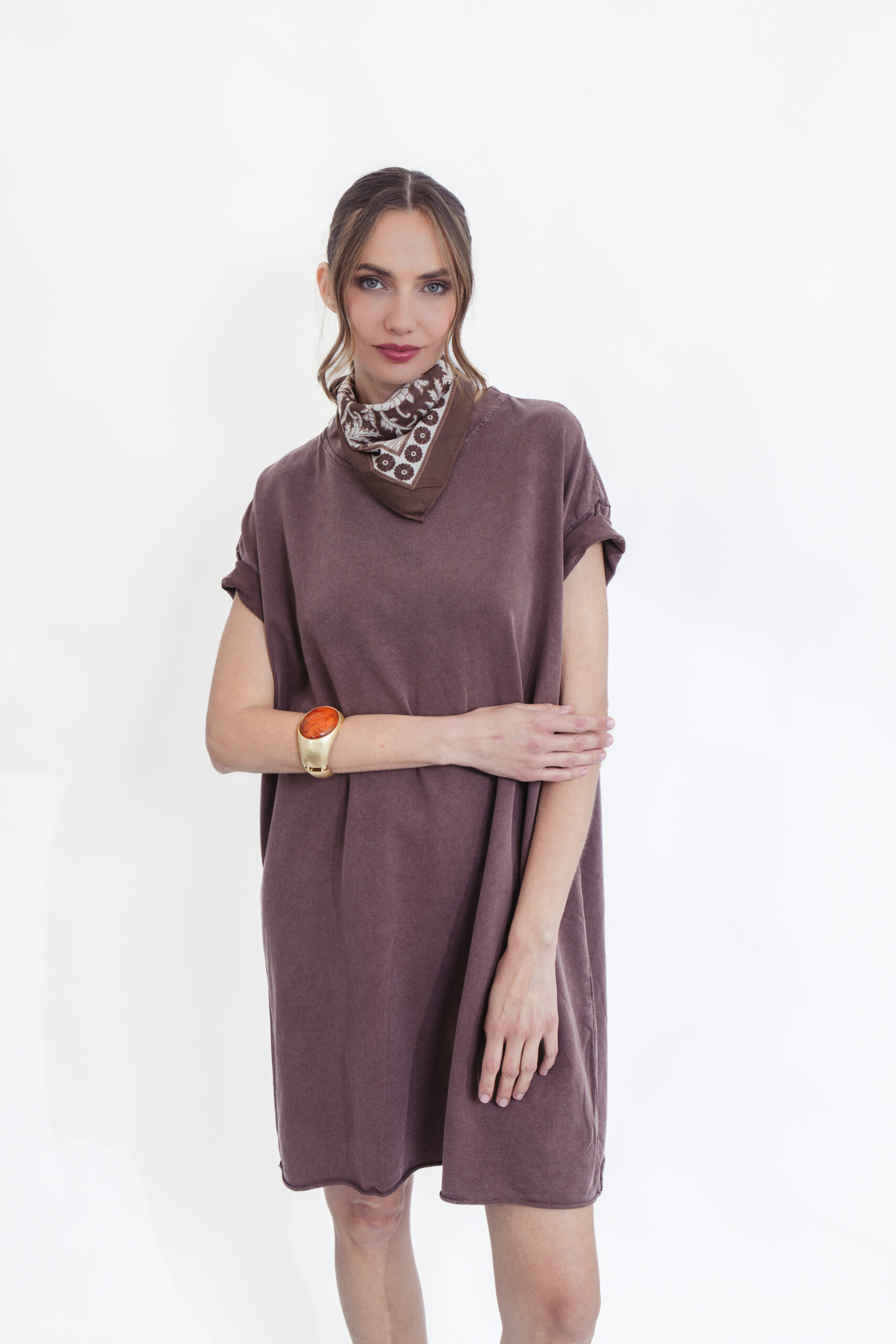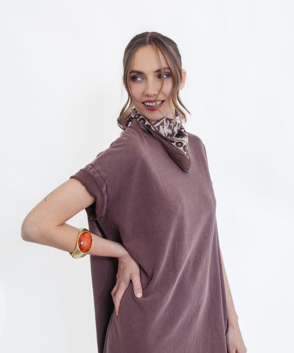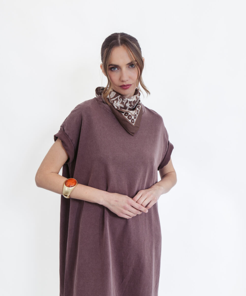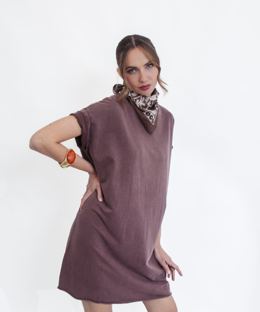 שמלת טי קלאסית בגוון חום עמוק וחם, שמשדרת אלגנטיות טבעית ושיק על-זמני. הגזרה המשוחררת והנינוחה מעניקה נוחות מקסימלית, עם שרוולים קצרים וקו נקי שמתאים לכל מבנה גוף – מושלמת ללוק יומיומי מוקפד ולא מתאמץ.