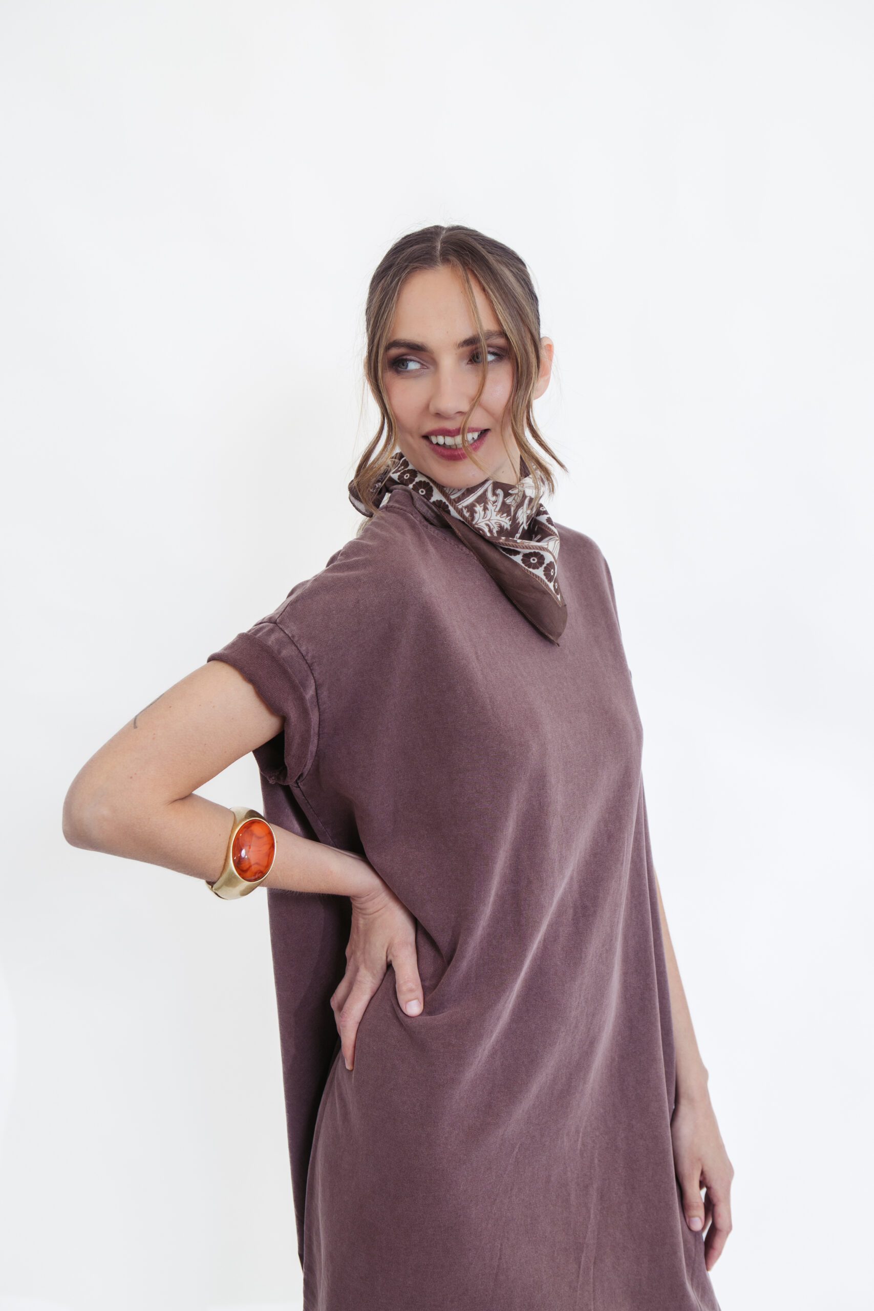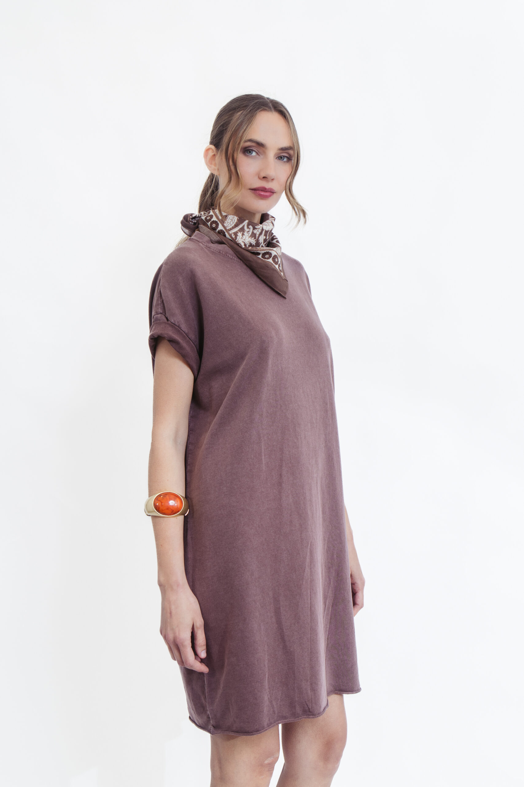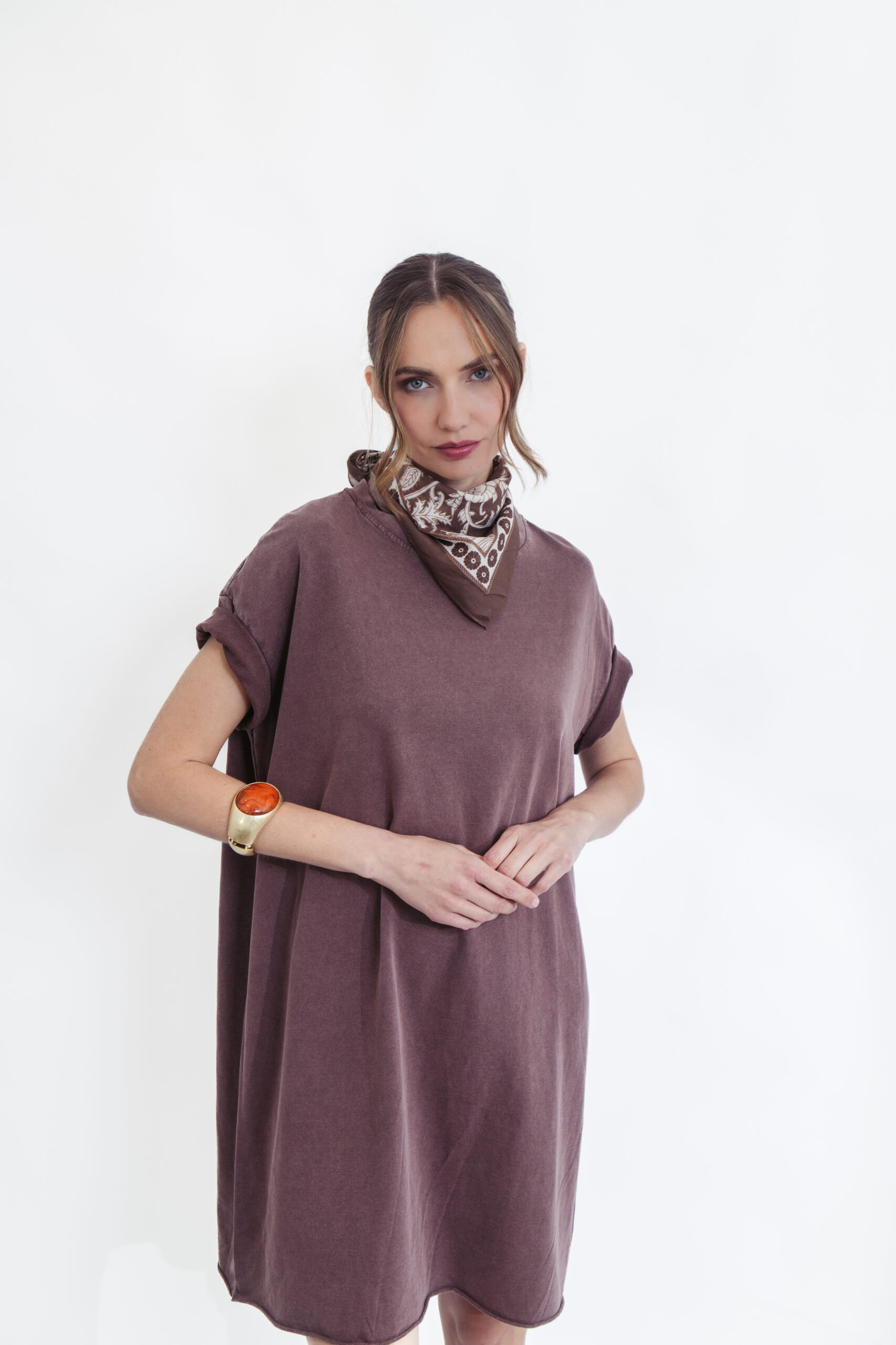 שמלת טי קלאסית בגוון חום עמוק וחם, שמשדרת אלגנטיות טבעית ושיק על-זמני. הגזרה המשוחררת והנינוחה מעניקה נוחות מקסימלית, עם שרוולים קצרים וקו נקי שמתאים לכל מבנה גוף – מושלמת ללוק יומיומי מוקפד ולא מתאמץ.